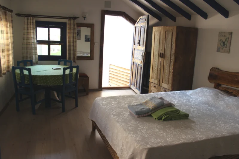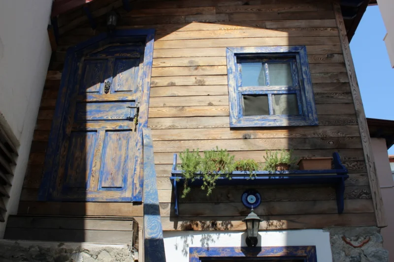Pencereler, mavi renkli eskitilmiş ahşaptan yapılmış giyotin tarzı tasarımıyla odanın karakterini tamamlamaktadır. Tavanda yer alan mavi renk eskitilmiş ahşap kirişler ve beyaz alçıpan tavan uygulaması, mavi-beyaz konsepti güçlü bir şekilde yansıtırken mekâna ferahlık kazandırır. Odada bulunan gardrop, eskitilmiş fakat boyanmamış doğal ahşaptan üretilmiş olup rustik görünümüyle dekorasyonu tamamlar.